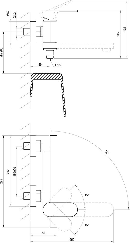 ✔ Міжосьовий розмір змішувача: 150 мм