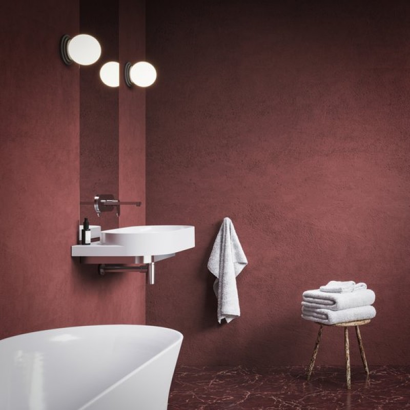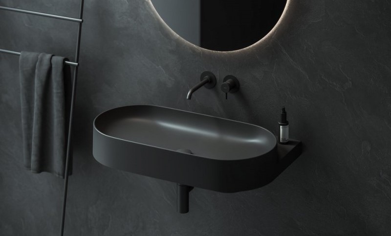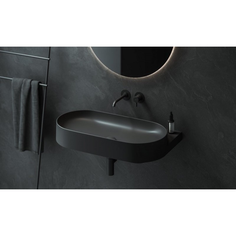 Овальний умивальник доповнюється елементом дизайну у вигляді кронштейна білого кольору, чорного або нержавіючої сталі. Магія елегантності поєднує кронштейн, змішувач, сифон та злив одного тону.