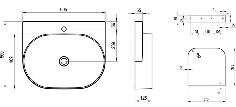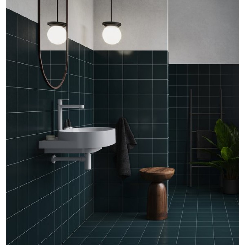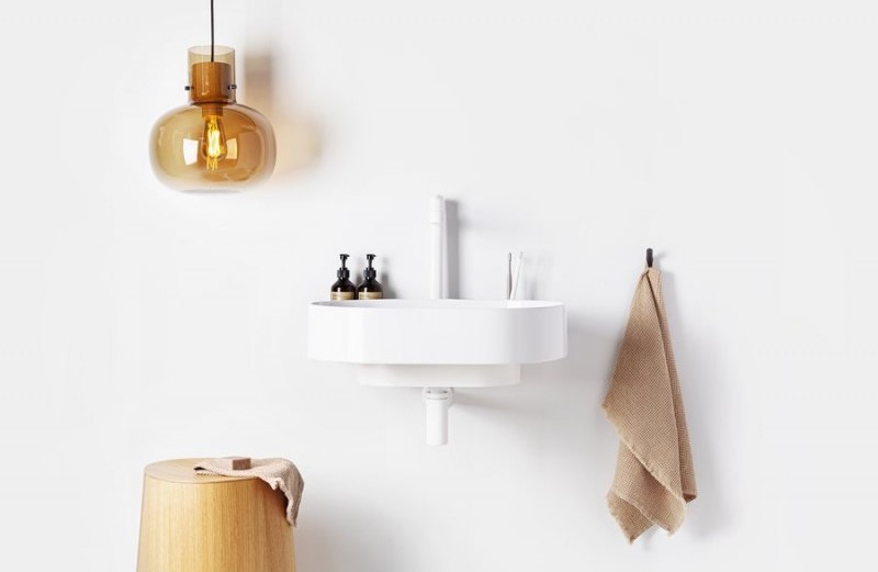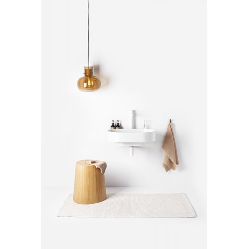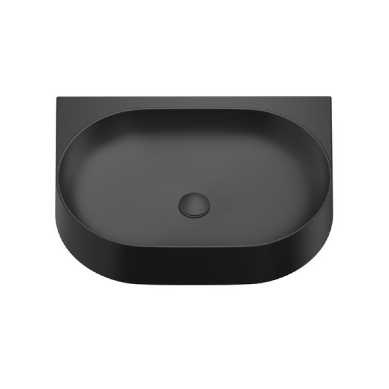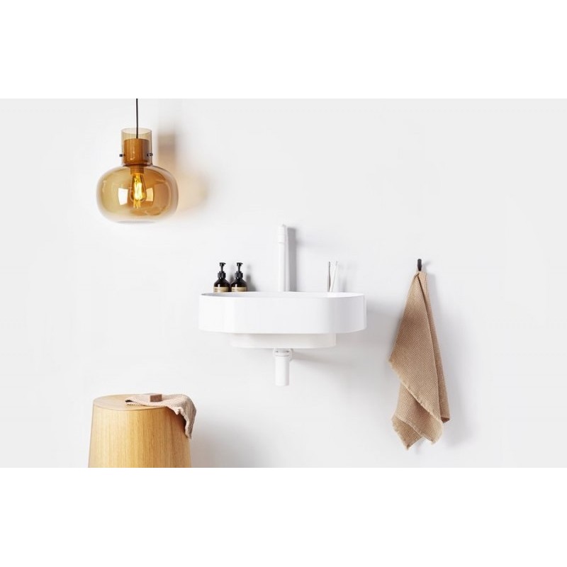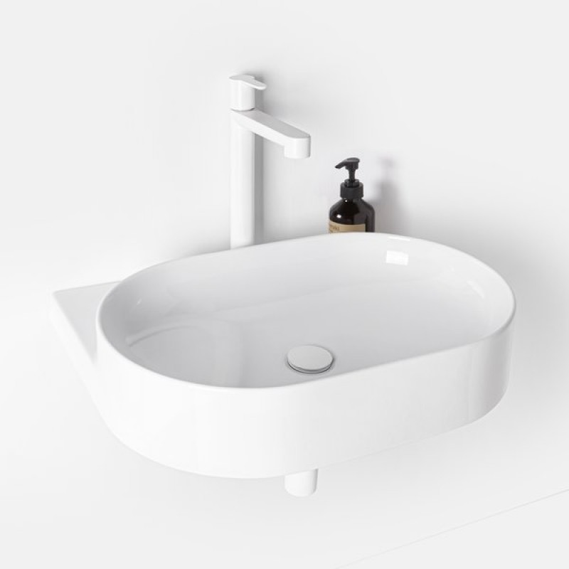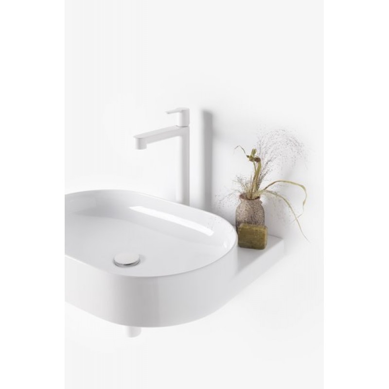 Овальний умивальник доповнюється елементом дизайну у вигляді кронштейна білого кольору, чорного або нержавіючої сталі. Магія елегантності поєднує кронштейн, змішувач, сифон та злив одного тону.