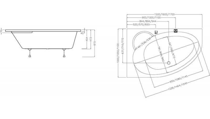 - на Asymmetric II 160/150 може встановлюватися штора для ванни VS3 у розмірі 100.