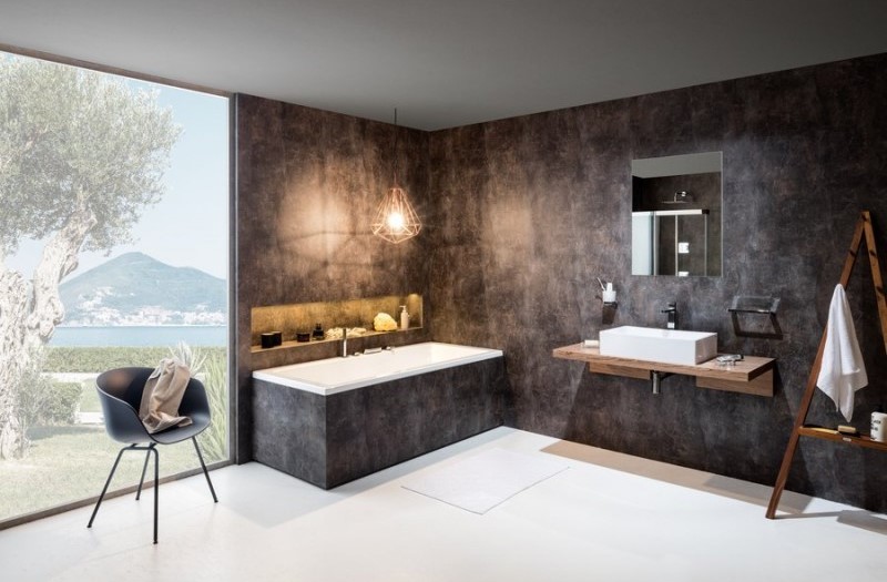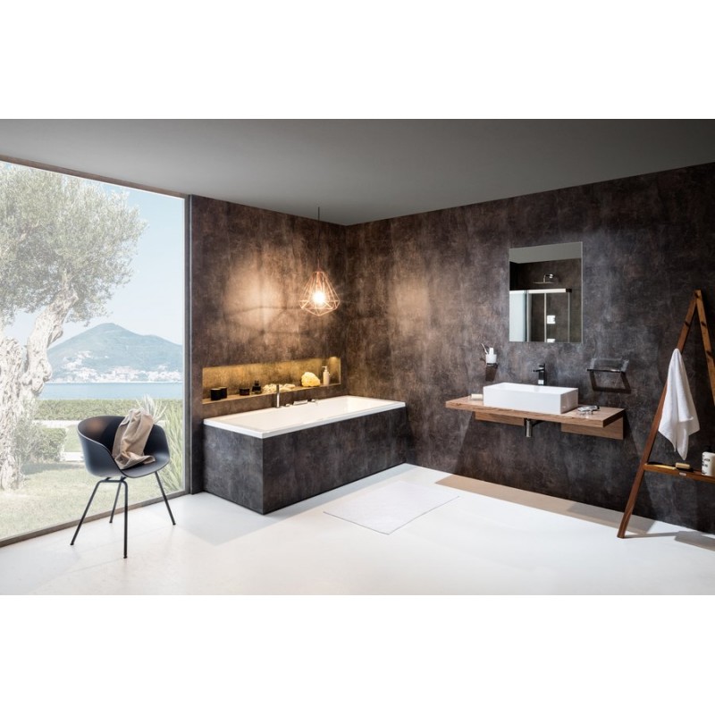 Мінімалістична, але водночас незвичайна ванна. Звичайну симетрію прямокутних ванн дизайнер змінив, зробивши один борт ширше за другий. Таким чином, ванна здобула новий вигляд і велику практичну цінність. Кожен може самостійно надати ванні закінчений естетичний вигляд (облицювати керамікою, деревом, штучним каменем, або ж використати передню і бічну панелі білого кольору).