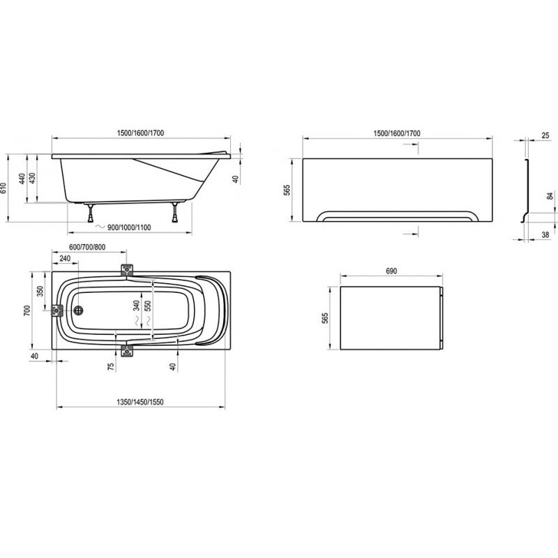 ✔ Додаткові аксесуари: опора, передня та бічна панелі у білому кольорі, стічний комплект для ванн.